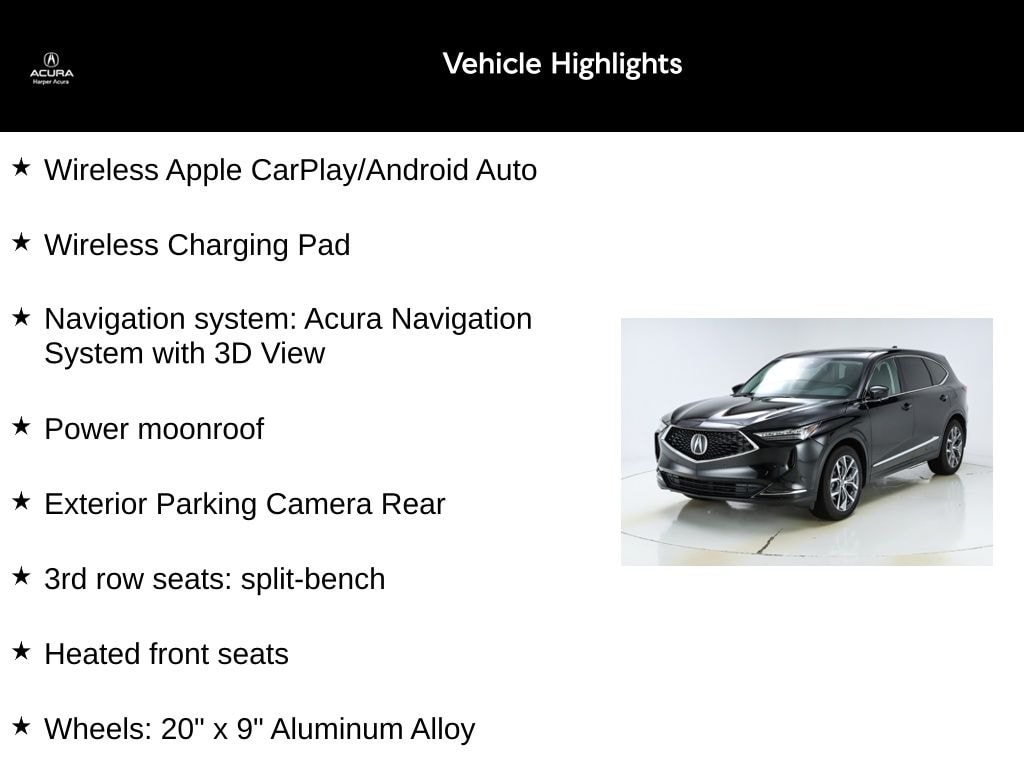 HARPER ACURA believes in the quality of the vehicles we sell so well that we provide an UNLIMITED MILES POWERTRAIN WARRANTY on every new and qualifying pre-owned vehicle it sells!!! This warranty is good at any ASE certified shop in the 48 continental United States!! Check out all these great options 3rd row seats: split-bench, Exterior Parking Camera Rear, Heated front seats, Navigation system: Acura Navigation System with 3D View, Power moonroof, Wheels: 20" x 9" Aluminum Alloy, 12 Speakers, 4-Wheel Disc Brakes, 4.17 Axle Ratio, A/V remote: CabinControl, ABS brakes, Air Conditioning, Alloy wheels, AM/FM radio: SiriusXM, Anti-whiplash front head restraints, Apple CarPlay/Android Auto, Audio memory, Auto High-beam Headlights, Auto tilt-away steering wheel, Auto-dimming Rear-View mirror, Automatic temperature control, Brake assist, Bumpers: body-color, Compass, Delay-off headlights, Driver door bin, Driver vanity mirror, Dual front impact airbags, Dual front side impact airbags, Electronic Stability Control, Emergency communication system: AcuraLink, Four wheel independent suspension, Front anti-roll bar, Front Bucket Seats, Front Center Armrest, Front dual zone A/C, Front reading lights, Fully automatic headlights, Garage door transmitter: HomeLink, Heated door mirrors, Heated Front Sport Seats, HVAC memory, Illuminated entry, Knee airbag, Lane departure: Lane Keeping Assist System (LKAS) active, Leather steering wheel, Low tire pressure warning, Memory seat, Occupant sensing airbag, Outside temperature display, Overhead airbag, Overhead console, Panic alarm, Passenger door bin, Passenger vanity mirror, Perforated Premium Milano Leather Trimmed Seats, Power door mirrors, Power driver seat, Power Liftgate, Power passenger seat, Power steering, Power windows, Premium audio system: Acura/ELS Surround, Radio data system, Radio: ELS Studio Premium Audio System, Rain sensing wipers, Rear air conditioning, Rear anti-roll bar, Rear reading lights, Rear seat center armrest, Rear window defroster, Rear window wiper, Remote keyless entry, Security system, Speed control, Speed-sensing steering, Speed-Sensitive Wipers, Split folding rear seat, Spoiler, Steering wheel memory, Steering wheel mounted audio controls, Tachometer, Telescoping steering wheel, Tilt steering wheel, Traction control, Trip computer, Turn signal indicator mirrors, and Variably intermittent wipers. Certified.