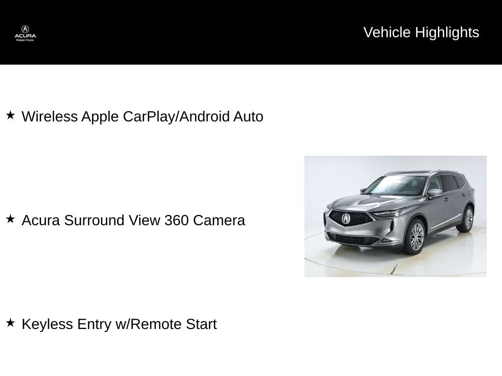 HARPER ACURA believes in the quality of the vehicles we sell so well that we provide an UNLIMITED MILES POWERTRAIN WARRANTY on every new and qualifying pre-owned vehicle it sells!!! This warranty is good at any ASE certified shop in the 48 continental United States!! Check out all these great options Exterior Parking Camera Rear, Heads-Up Display, Heated & Ventilated Front Sport Seats, Heated rear seats, Heated steering wheel, Navigation system: Acura Navigation System with 3D View, Power Liftgate, Power moonroof, Premium audio system: Acura/ELS Studio 3D, Wheels: 20" x 9J Aluminum Alloy, 16 Speakers, 3rd row seats: split-bench, 4-Wheel Disc Brakes, 4.17 Axle Ratio, A/V remote: CabinControl, ABS brakes, Adaptive suspension, Air Conditioning, Alloy wheels, AM/FM radio: SiriusXM, Anti-whiplash front head restraints, Apple CarPlay/Android Auto, Audio memory, Auto High-beam Headlights, Auto tilt-away steering wheel, Auto-dimming Rear-View mirror, Automatic temperature control, Brake assist, Bumpers: body-color, Compass, Delay-off headlights, Driver door bin, Driver vanity mirror, Dual front impact airbags, Dual front side impact airbags, Electronic Stability Control, Emergency communication system: AcuraLink, Four wheel independent suspension, Front anti-roll bar, Front Bucket Seats, Front Center Armrest, Front dual zone A/C, Front fog lights, Front reading lights, Fully automatic headlights, Garage door transmitter: HomeLink, Heated door mirrors, Heated front seats, HVAC memory, Illuminated entry, Knee airbag, Lane departure: Lane Keeping Assist System (LKAS) active, Leather steering wheel, Low tire pressure warning, Memory seat, Occupant sensing airbag, Outside temperature display, Overhead airbag, Overhead console, Panic alarm, Passenger door bin, Passenger vanity mirror, Perforated Premium Milano Leather Trimmed Seats, Power door mirrors, Power driver seat, Power passenger seat, Power steering, Power windows, Radio data system, Radio: ELS Studio 3D Premium Audio System, Rain sensing wipers, Rear air conditioning, Rear anti-roll bar, Rear reading lights, Rear seat center armrest, Rear window defroster, Rear window wiper, Remote keyless entry, Security system, Speed control, Speed-sensing steering, Speed-Sensitive Wipers, Split folding rear seat, Spoiler, Steering wheel memory, Steering wheel mounted audio controls, Tachometer, Telescoping steering wheel, Tilt steering wheel, Traction control, Trip computer, Turn signal indicator mirrors, Variably intermittent wipers, and Ventilated front seats.