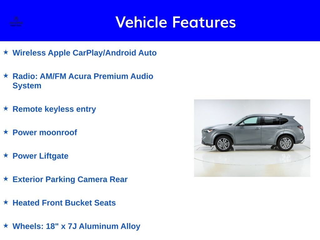 Elevate your commute with the ADX's advanced safety features, including Lane Keeping Assist System, Automatic High-Beam Headlights, and a Rear-View Camera. Enjoy the convenience of Keyless Entry, a Power Liftgate, and a Moonroof that floods the cabin with natural light.