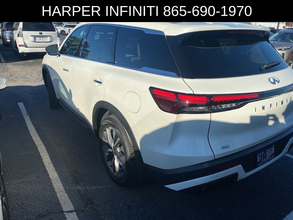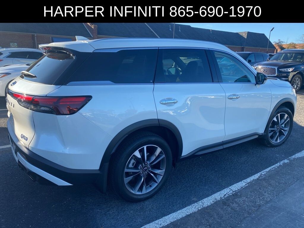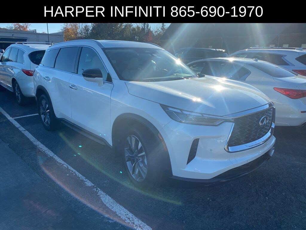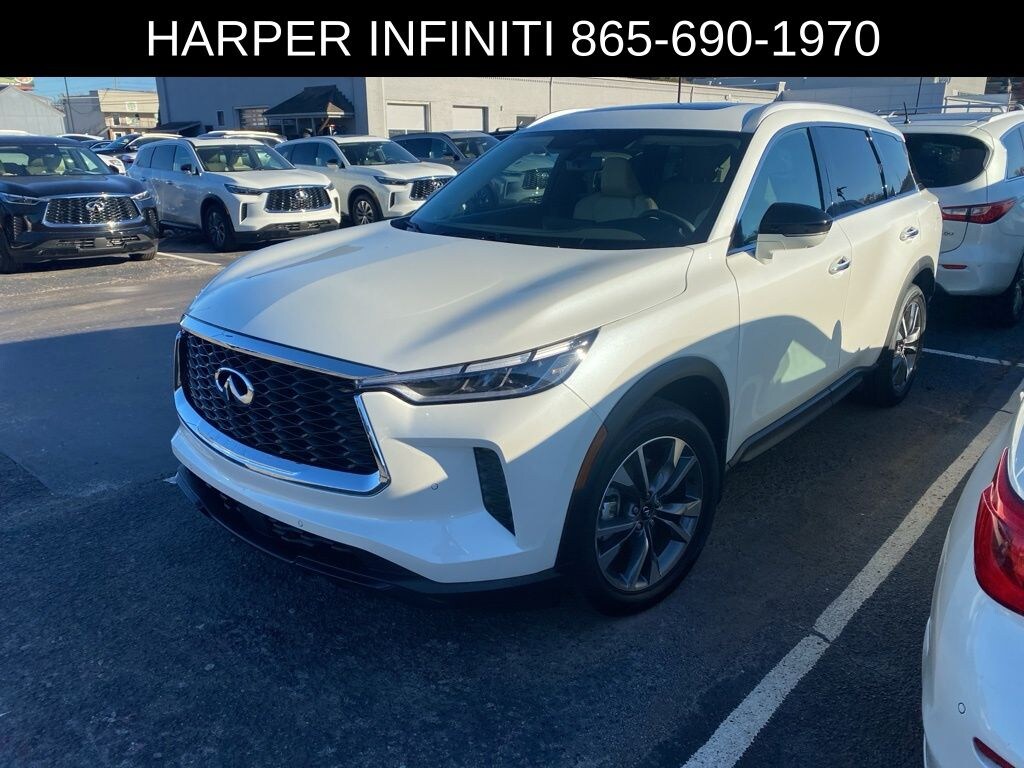 Harper INFINITI is proud to offer this stunning 2025 INFINITI QX60 in Majestic White HARPER INFINITI believes in the quality of the vehicles we sell so well that we provide an UNLIMITED MILES, POWERTRAIN WARRANTY on every new and qualifying pre-owned vehicle it sells!!! This warranty is good at any ASE certified shop in the 48 continental United States!! Check out all these great options Navigation system: INFINITI InTouch Navigation, 3rd row seats: bench, 4-Wheel Disc Brakes, ABS brakes, Air Conditioning, Alloy wheels, AM/FM radio: SiriusXM, Auto High-beam Headlights, Auto tilt-away steering wheel, Auto-dimming Rear-View mirror, Automatic temperature control, Brake assist, Delay-off headlights, Driver door bin, Driver vanity mirror, Dual front impact airbags, Dual front side impact airbags, Electronic Stability Control, Exterior Parking Camera Rear, Four wheel independent suspension, Front anti-roll bar, Front Bucket Seats, Front dual zone A/C, Front reading lights, Fully automatic headlights, Garage door transmitter: HomeLink, Heated door mirrors, Heated front seats, Heated rear seats, Heated steering wheel, Illuminated entry, Knee airbag, Leather Shift Knob, Leather steering wheel, Leather-Appointed Seating Surfaces, Low tire pressure warning, Memory seat, Occupant sensing airbag, Outside temperature display, Overhead airbag, Overhead console, Panic alarm, Passenger door bin, Passenger vanity mirror, Power door mirrors, Power driver seat, Power Liftgate, Power moonroof, Power passenger seat, Power steering, Power windows, Radio data system, Rain sensing wipers, Rear air conditioning, Rear anti-roll bar, Rear reading lights, Rear side impact airbag, Rear window defroster, Rear window wiper, Reclining 3rd row seat, Remote keyless entry, Security system, Speed control, Speed-sensing steering, Speed-Sensitive Wipers, Split folding rear seat, Spoiler, Steering wheel memory, Steering wheel mounted audio controls, Tachometer, Telescoping steering wheel, Tilt steering wheel, Traction control, Trip computer, Turn signal indicator mirrors, and Variably intermittent wipers.