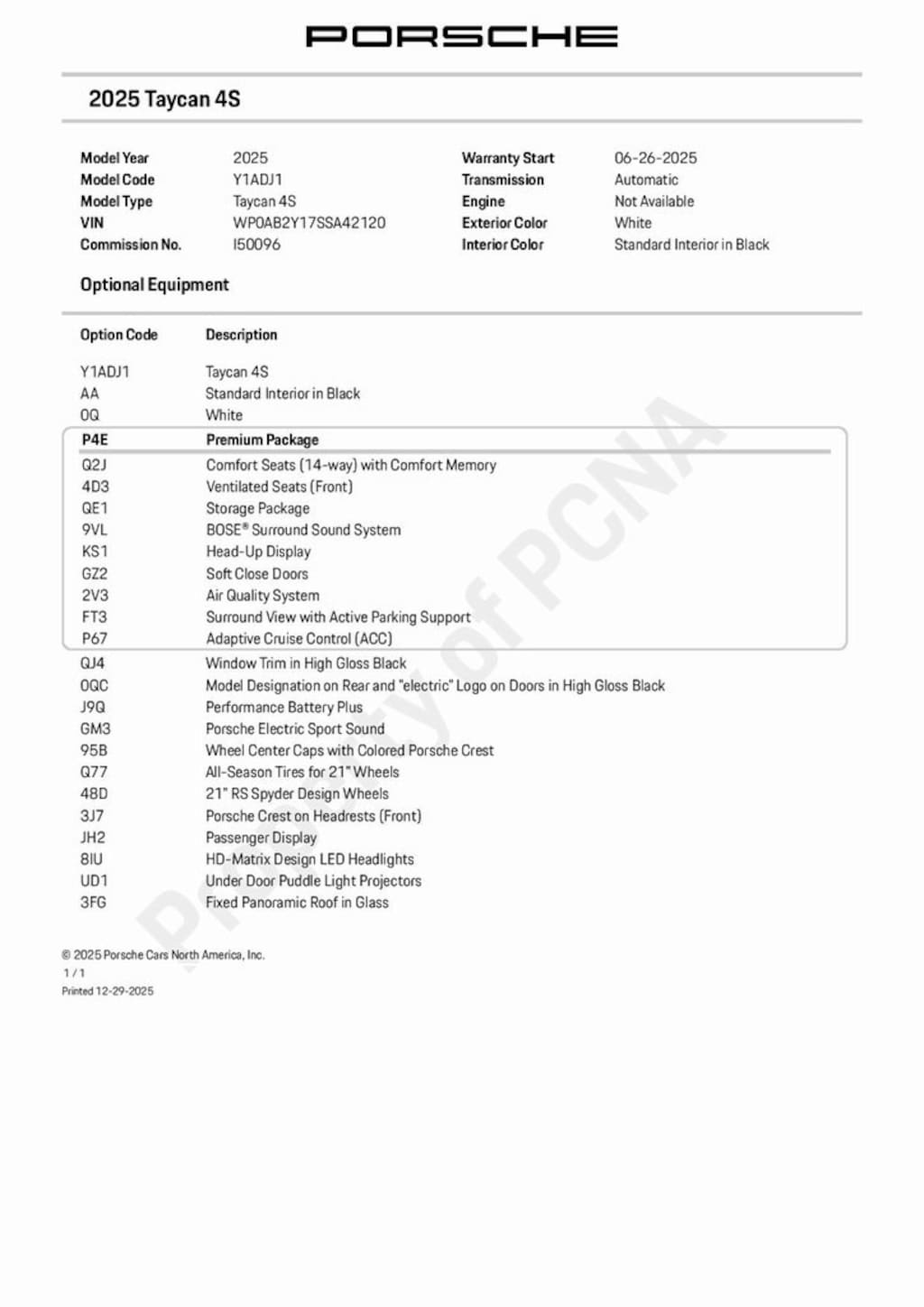 Includes Porsche Scheduled Maintenance up to 2 years/20k miles! 2025 Porsche Taycan 4S AWD in White over Black leather interior. Electric Motor mated to a 2-Speed Automatic Transmission. For all options, please view the Porsche Build Sheet located within the vehicle's photos.