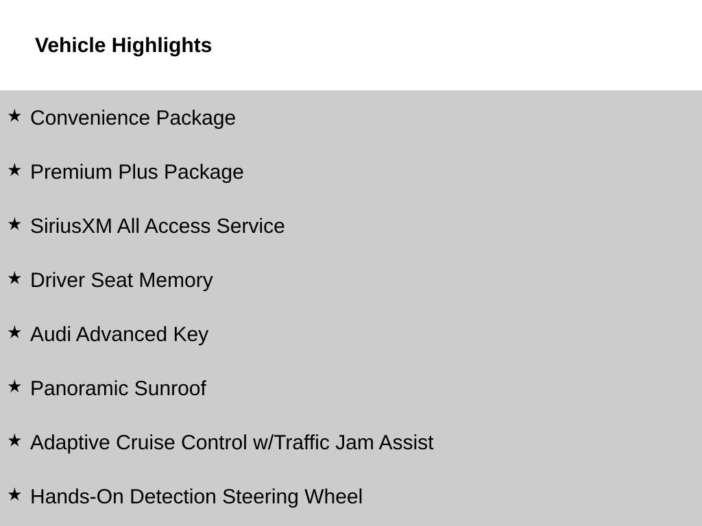 - Smart device integration: Audi smartphone interface w/wireless CarPlay
