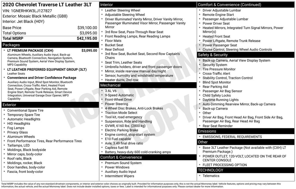 Check out all these great options LT Premium Package (120-Volt Power Outlet, Bose Premium 10-Speaker Audio System Feature, HD Surround Vision, Radio: Chevrolet Infotainment 3 Premium System, Rear Camera Mirror, and Wheels: 20" Machined Face Aluminum), Preferred Equipment Group 3LT, 3rd row seats: split-bench, 4-Wheel Disc Brakes, 6 Speakers, 7-Passenger Seating (2-2-3 Seating Configuration), ABS brakes, Air Conditioning, Alloy wheels, AM/FM radio: SiriusXM, Apple CarPlay/Android Auto, Automatic temperature control, Brake assist, Bumpers: body-color, Delay-off headlights, Dual front impact airbags, Dual front side impact airbags, Electronic Stability Control, Emergency communication system: OnStar and Chevrolet connected services capable, Four wheel independent suspension, Front anti-roll bar, Front Bucket Seats, Front dual zone A/C, Front fog lights, Fully automatic headlights, Garage door transmitter, Heated door mirrors, Heated front seats, High-Intensity Discharge Headlights, Leather steering wheel, Leather-Appointed Seat Trim, Low tire pressure warning, Navigation System, Occupant sensing airbag, Overhead airbag, Panic alarm, Power door mirrors, Power driver seat, Power Liftgate, Power passenger seat, Power steering, Power windows, Premium audio system: Chevrolet MyLink, Radio data system, Radio: Chevrolet Infotainment 3 Plus System, Rear air conditioning, Rear anti-roll bar, Rear window defroster, Rear window wiper, Remote keyless entry, Roof rack: rails only, Security system, SiriusXM w/360L, Speed control, Speed-sensing steering, Steering wheel mounted audio controls, Telescoping steering wheel, Tilt steering wheel, Traction control, Turn signal indicator mirrors, Variably intermittent wipers, 3.49 Axle Ratio, Compass, Driver door bin, Driver vanity mirror, Front Center Armrest, Front reading lights, Illuminated entry, Outside temperature display, Overhead console, Passenger doo