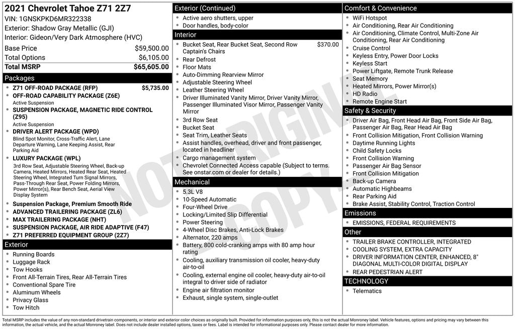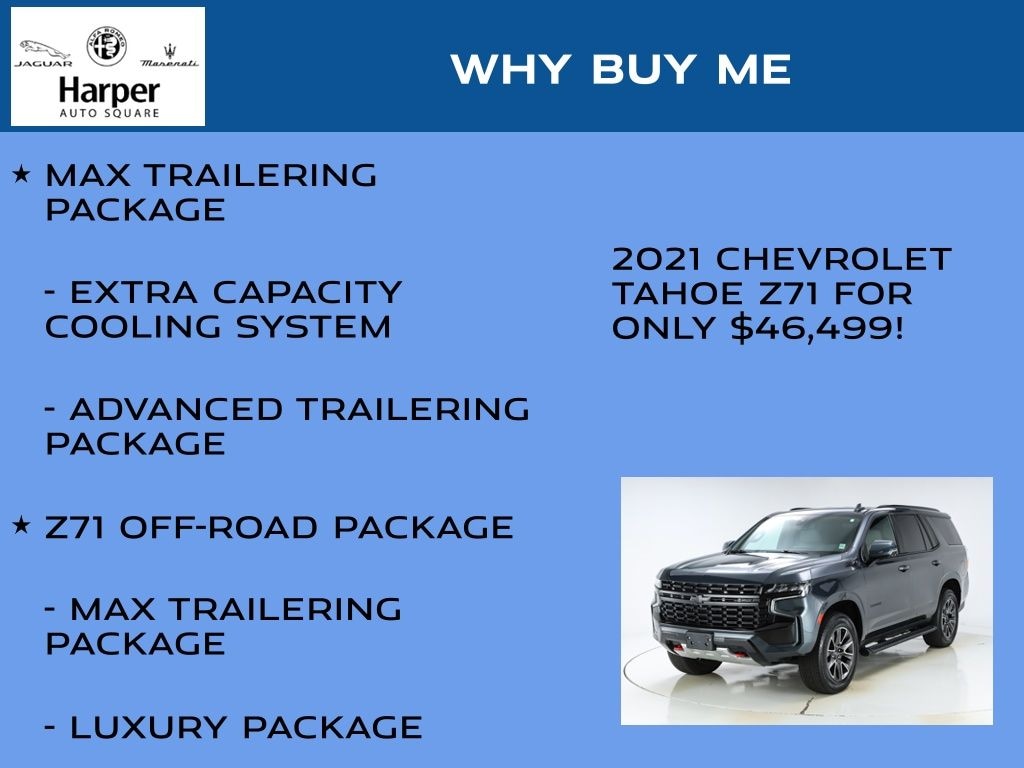 Check out all these great options Advanced Trailering Package (Advanced Trailering System, Hitch Guidance w/Hitch View, and Integrated Trailer Brake Controller), Driver Alert Package (Front & Rear Park Assist, Lane Change Alert w/Side Blind Zone Alert, Lane Keep Assist w/Lane Departure Warning, and Rear Cross Traffic Alert), Luxury Package (2nd Row Pwr Release 60/40 Split-Folding Bench Seat, 3rd Row 60/40 Power-Folding Split-Bench Seat, Automatic Heated Steering Wheel, HD Surround Vision, Heated 2nd Row Outboard Seats, Memory Settings, Outside Heated Power-Adjustable Mirrors, Power Tilt & Telescopic Steering Column, and Rear Pedestrian Alert), Max Trailering Package (Extra Capacity Cooling System), Off-Road Capability Package (Air Ride Adaptive Suspension, Enhanced Driver Information Center, and Magnetic Ride Control Suspension), Z71 Off-Road Package, Preferred Equipment Group 2Z7 (Black Tubular Assist Steps, Driver & Front Outboard Passenger Airbags, Hands-Free Rear Power Programmable Liftgate, Infotainment Display, LED Daytime Running Lamps, SiriusXM Radio w/360L, 1st & 2nd Row Color-Keyed Carpeted Floor Mats, 2 USB Data Ports, 2-Speed Active Electronic AutoTrac Transfer Case, Bright Front & Rear Door Sill Plates, Color-Keyed Carpeting Floor Covering, Floor Console w/Storage Area, Front High-Approach Angle Fascia, HD Radio, Hill Descent Control, Leather-Wrapped Steering Wheel, Memory