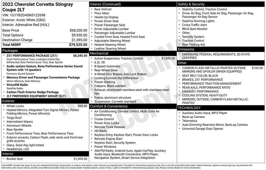 Check out all these great options Carbon Flash Metallic Painted Outside Mirrors (Carbon Flash Metallic-Painted Outside Mirrors), Memory Driver & Passenger Convenience Package, Preferred Equipment Group 2LT (2 Cargo Nets, Driver Power Bolster Seat Adjuster, Electrical Theft Deterrent System, HD Front & Rear Vision Cameras, Head-Up Display, Heated & Vented Driver & Passenger Seats, Heated Steering Wheel, Passenger Power Bolster Seat Adjuster, Performance Data & Video Recorder, Power Driver Lumbar Control Seat Adjuster, Power Passenger Lumbar Control Seat Adjuster, Power-Adjustable Outside Heated Mirrors, Rear Camera Mirror, Rear Cross Traffic Alert, Rear Park Assist, Side Blind Zone Alert, Universal Home Remote, Vehicle Inclination Theft Deterrent Sensor, Vehicle Interior Movement Theft Deterrent Sensor, and Wireless Charging for Devices), Z51 P