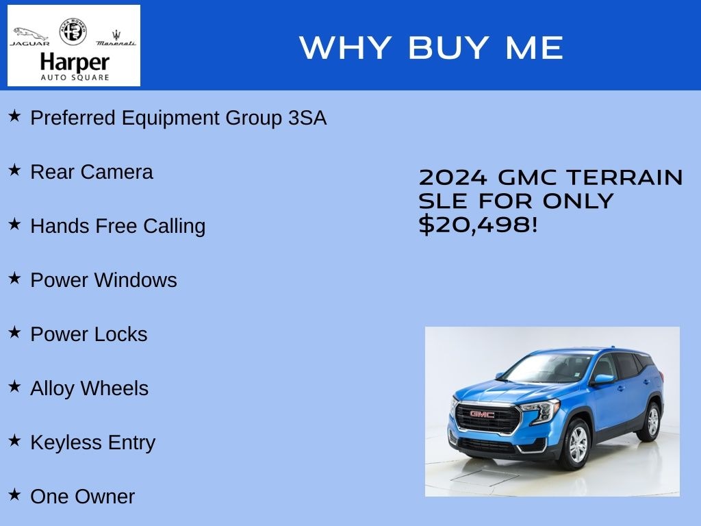 Check out all these great options Preferred Equipment Group 3SA, License Plate Front Mounting Package, 2 USB Data Ports w/Auxiliary Input Jack, 4-Way Manual Driver's Seat, 4-Way Manual Front Passenger Seat, 4-Wheel Disc Brakes, 4.2" Multi-Color Driver Information Screen, 6 Speakers, 6-Speaker Audio System Feature, ABS brakes, Air Conditioning, Alloy wheels, AM/FM radio: SiriusXM, Auto-dimming Rear-View mirror, Automatic temperature control, Bluetooth® For Phone, Brake assist, Bumpers: body-color, Delay-off headlights, Dual front impact airbags, Dual front side impact airbags, Electronic Stability Control, Emergency communication system: OnStar and GMC connected services capable, Four wheel independent suspension, Front anti-roll bar, Front Bucket Seats, Fully automatic headlights, Heated door mirrors, Low tire pressure warning, Occupant sensing airbag, Overhead airbag, Panic alarm, Power door mirrors, Power steering, Power windows, Premium Cloth Seat Trim, Radio data system, Radio: GMC Infotainment Audio System w/7" Display, Rear anti-roll bar, Rear window defroster, Rear window wiper, Remote keyless entry, Security system, SiriusXM, Speed-sensing steering, Split folding rear seat, Steering wheel mounted audio controls, Telescoping steering wheel, Tilt steering wheel, Traction control, Variably intermittent wipers, Wheels: 17" x 7" Silver Painted Aluminum, Wireless Apple CarPlay/Wireless Android Auto, 3.47 Final Drive Axle Ratio, Auto High-beam Headlights, Compass, Driver door bin, Driver vanity mirror, Front Center Armrest, Front reading lights, Illuminated entry, Outside temperature display, Overhead console, Passenger door bin, Passenger vanity mirror, Rear seat center armrest, Speed control, Spoiler, Tachometer, and Trip computer. Harper Maserati is very proud to offer this gorgeous-looking 2024 GMC Terrain in Riptide Metallic This vehicle has passed our comprehensive inspection and comes with the following features;